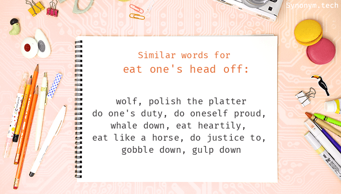 For more similar words, try Eat one's head off on Thesaurus.plus dictionary